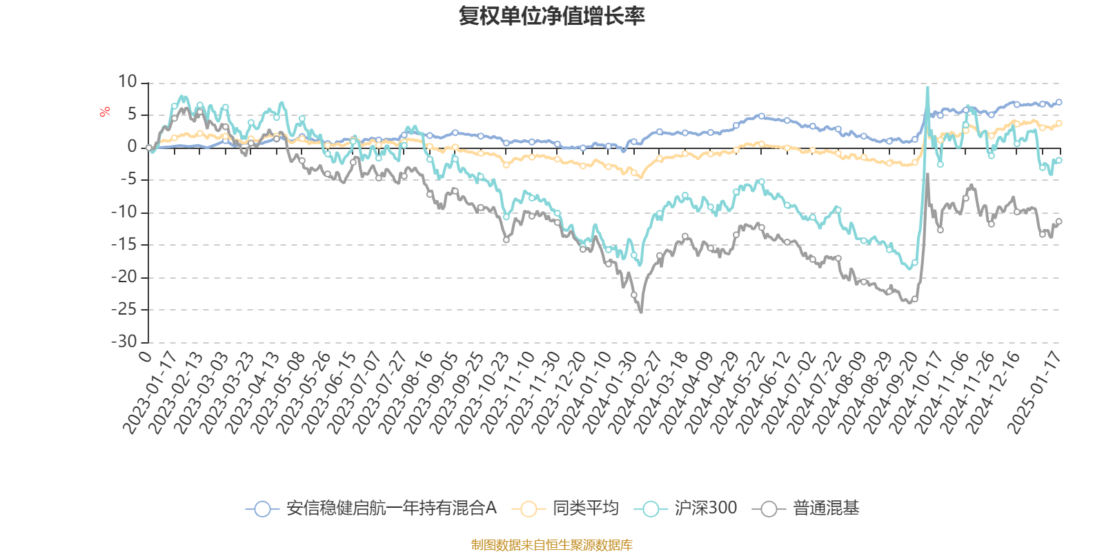 截至1月17日,安信稳健启航一年持有混合A近三个月复权单位净值增长率为1.95%,位于同类可比基金263/670;近半年复权单位净值增长率为4.03%,位于同类可比基金258/670;近一年复权单位净值增长率为7.09%,位于同类可比基金280/664。